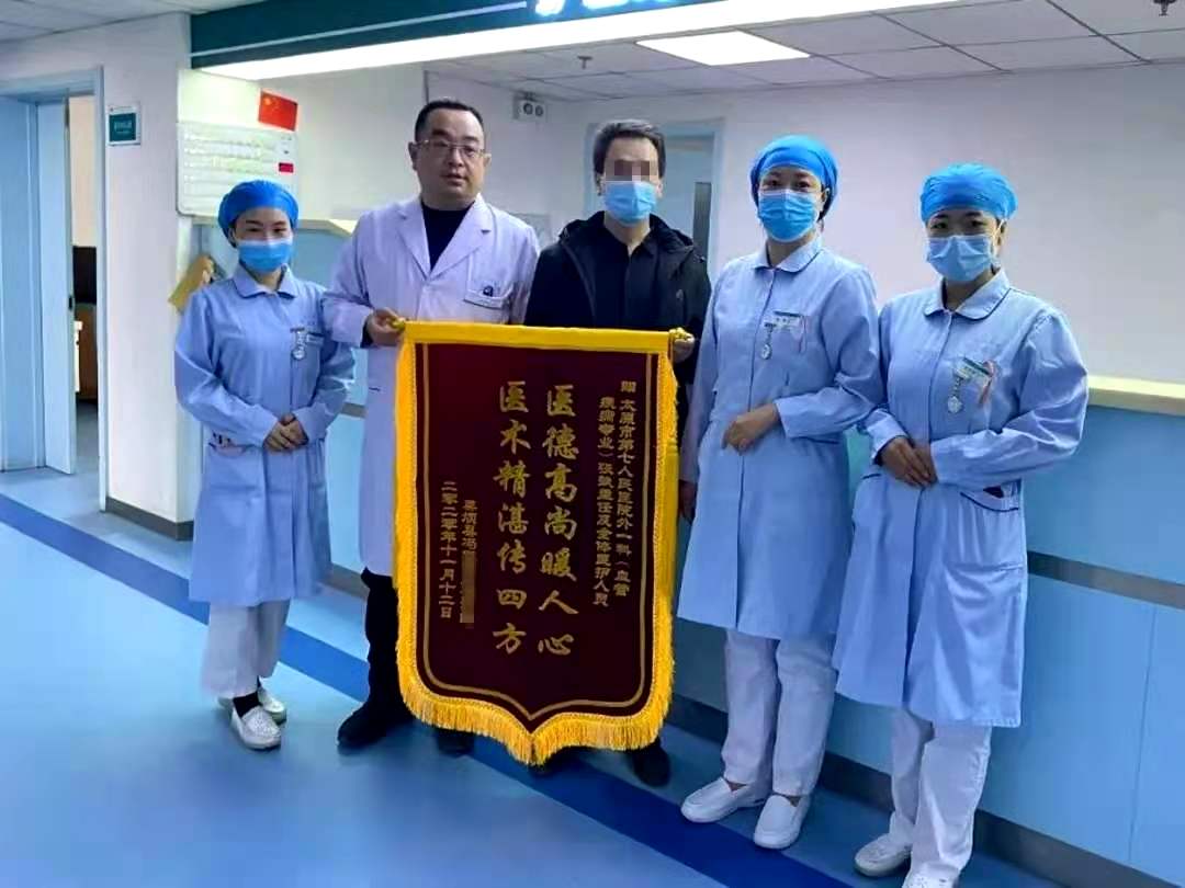 2022年9月27日上午,成人快手 多学科协作诊疗部患者妈妈薛女士将写有“德艺双磬,名医家风”、“大医精诚,止于至善”的两面鲜红锦旗分别送给科室刘东红主任和赵俊平主