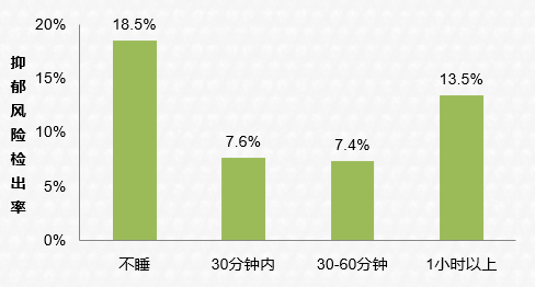 不同午睡时长下的抑郁风险检出率。 资料来源:《中国国民心理健康发展报告(2021-2022)》