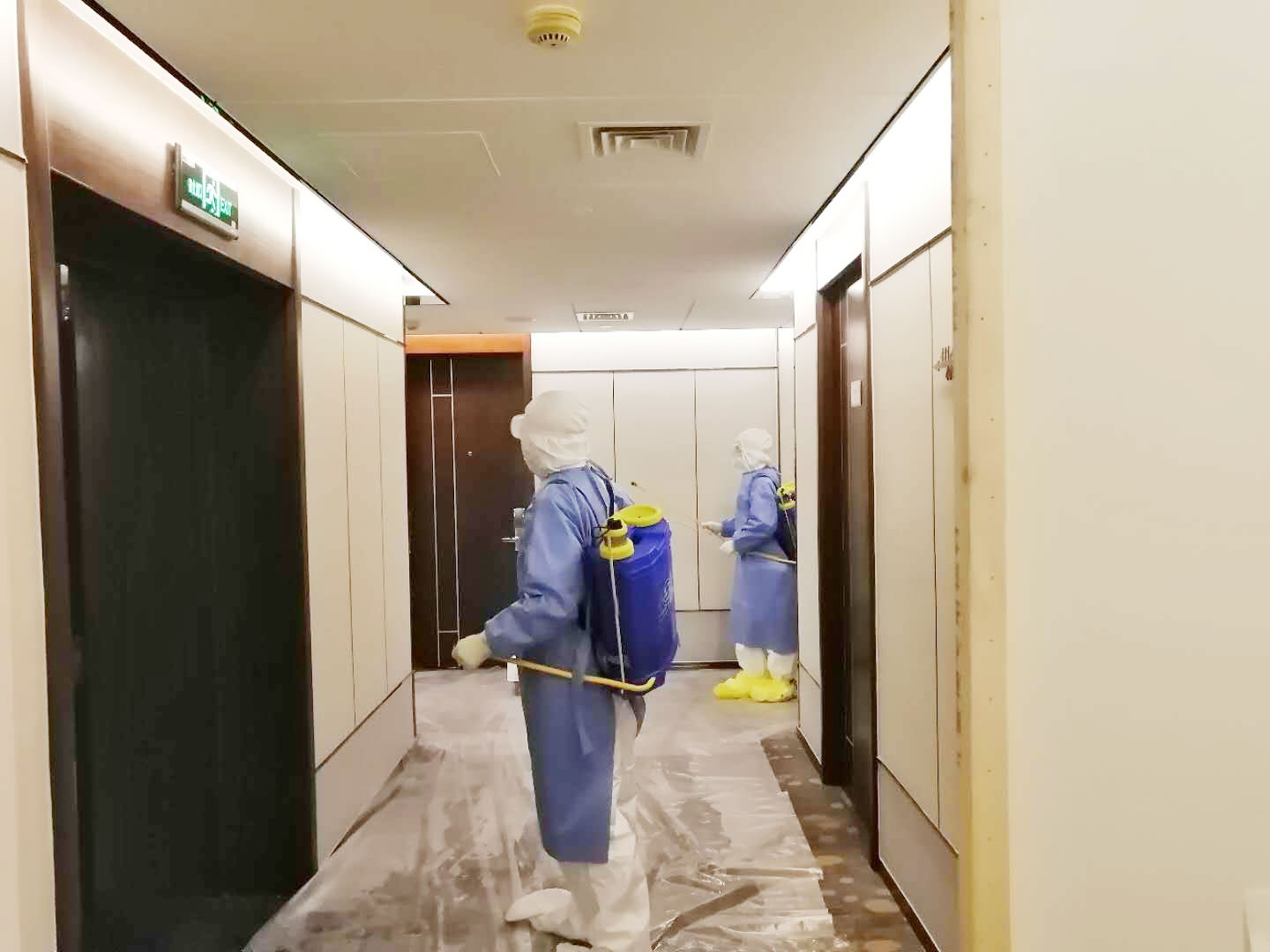 从一层到十四层,从前台大厅到每一间客房;从每一个门把手到每一个走廊角落;从门前置物凳到门前垃圾桶;左手打压,右手拿着喷雾杆从上到下,从左到右,重复上千次都丝毫没有放松过。