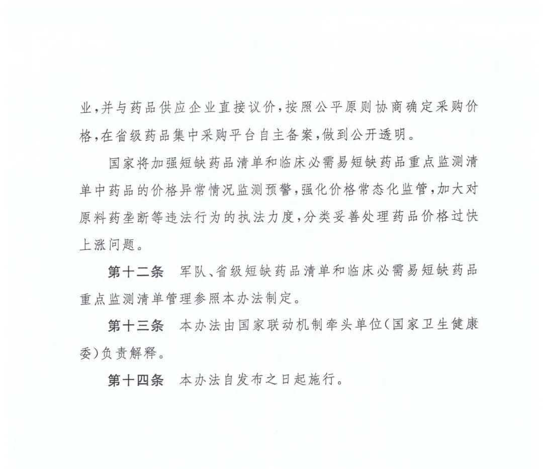 《国家短缺药品清单管理办法(试行)》体现了科学严谨、严格准入、分级应对、避免恶意涨价等政策导向,既要保障群众基本用药需求,也要稳定药品价格,加大价格监管和执法力度。本办法共十四条:第一至四条明确了制定依据,短缺药品、临床必需易短缺药品的定义,本办法的适用范围和制定主体;第五至九条明确了国家短缺药品清单和临床必需易短缺药品重点监测清单的制定原则和程序,包括形成基础清单、专家论证、组织复核、审核发布等重点环节;第十条明确了国家短缺药品清单的调出原则;第十一条明确了纳入短缺药品清单和临床必需易短缺药品重点监测清单药品的采购政策和价格监管政策;第十二条至十四条为相关附则。